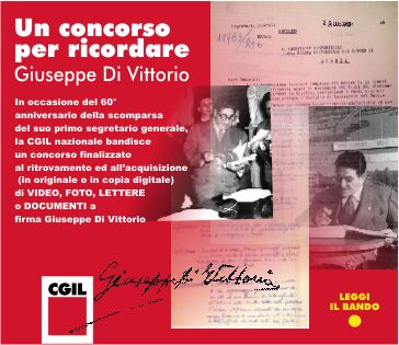 In occasione del 60° anniversario della scomparsa del suo primo segretario generale, la CGIL nazionale bandisce un concorso finalizzato al ritrovamento ed all’acquisizione (in originale o in copia digitale) di VIDEO, FOTO, LETTERE o DOCUMENTI a firma Giuseppe Di Vittorio, non conservati nei nostri Archivi.