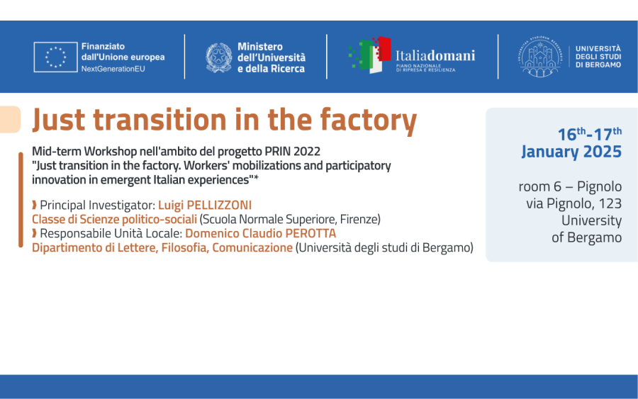 Serena Rugiero, responsabile dell'area ricerca energia, sviluppo e innovazione, interverrà al workshop organizzato dall'Università di Bergamo, nell'ambito del progetto di ricerca PRIN 2022 "Just transition in the factory. Workers' mobilizations and participatory innovation in emergent Italian experiences", nella prima sessione in programma giovedì 16 gennaio alle ore 14:30.