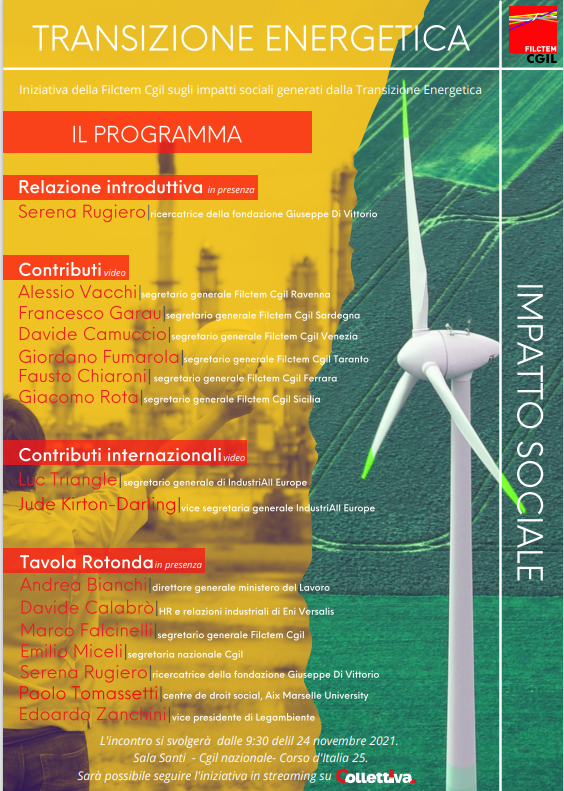 Mercoledì 24 novembre 2021, dalle ore 9.30 presso la Sala Santi della Cgil nazionale, e in diretta sul sito collettiva (www.collettiva.it) si terrà il convegno dal titolo: “Gli impatti sociali della transizione energetica. Dai territori all’Europa: le criticità e le proposte”.
