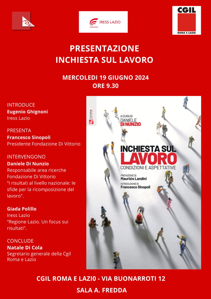 Sarà presentata mercoledì 19 giugno, dalle 9.30, presso la sede della Cgil di Roma e del Lazio, l’inchiesta sul lavoro condotta dalla Fondazione Di Vittorio in collaborazione con tutte le strutture sindacali della Cgil, attraverso un ampio gruppo di ricerca interdisciplinare.