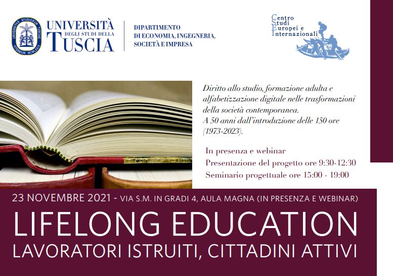 Martedì 23 novembre 2021 a Viterbo alle ore 9.30, presso l’Aula Magna dell’Università degli Studi della Tuscia in Via S. M. in Gradi 4, (in presenza e Webinar), si terrà il dibattito “Lifelong education. Lavoratori istruiti, cittadini attivi.”