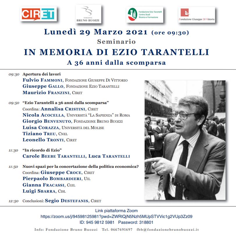 Al seminario parteciperanno esponenti del CIRET e di diverse Università italiane, i rappresentanti delle Fondazioni, la famiglia Tarantelli, i Segretari Generali di Cisl e Uil e, per la CGIL, la Vicesegretaria Generale Gianna Fracassi. Per la Fondazione Di Vittorio sarà presente il Presidente Fulvio Fammoni.