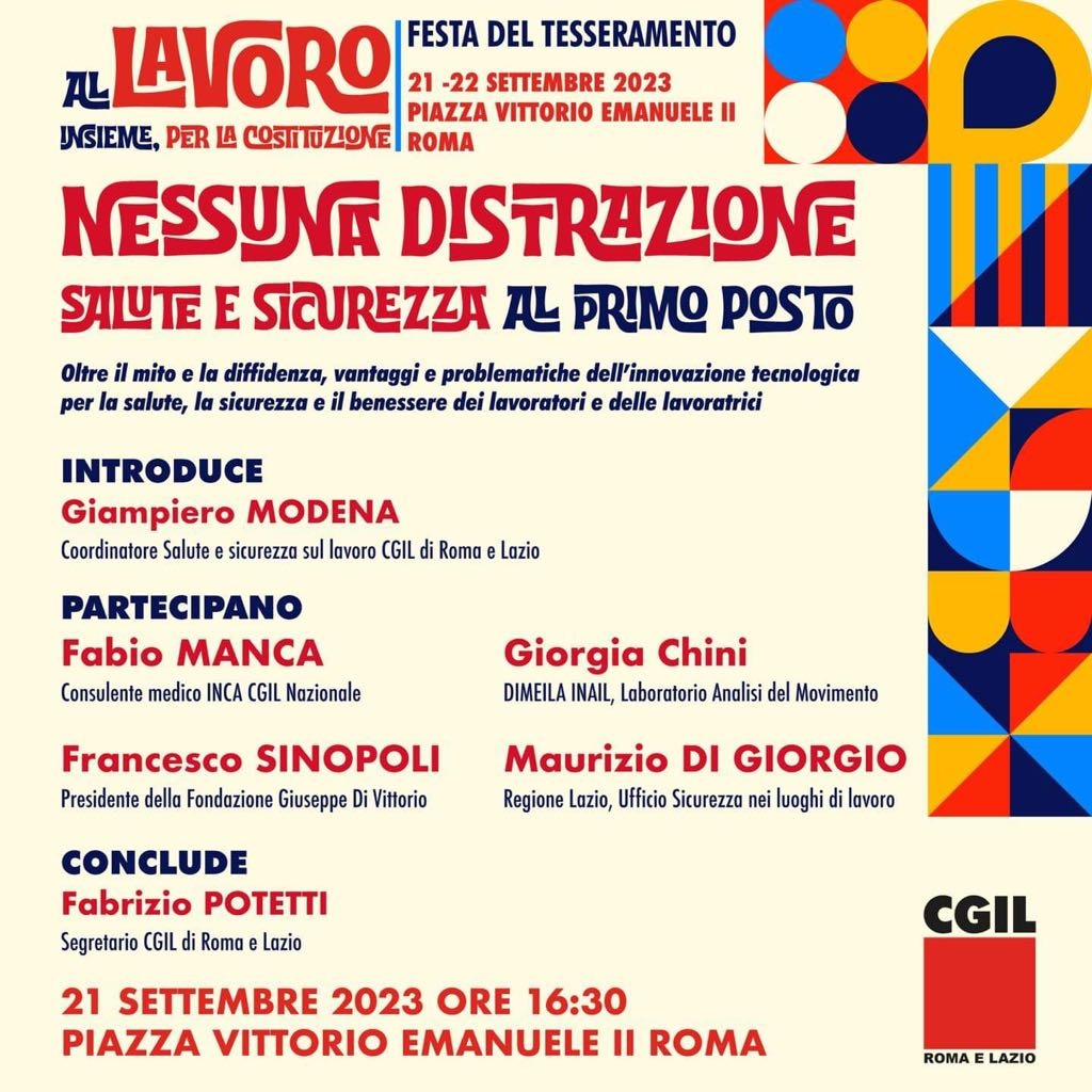 Il giorno 21 settembre alle ore 16.30, a Roma presso i giardini di Piazza Vittorio Emanuele, nell'ambito della Festa del Tesseramento organizzata dalla CGIL Roma e Lazio, si terrà un dibattito dal titolo "Nessuna distrazione. Salute e sicurezza al primo posto" sul tema dell'innovazione tecnologica per la salute, la sicurezza e il benessere dei lavoratori e delle lavoratrici. Per la Fondazione Di Vittorio sarà presente il Presidente Francesco Sinopoli.