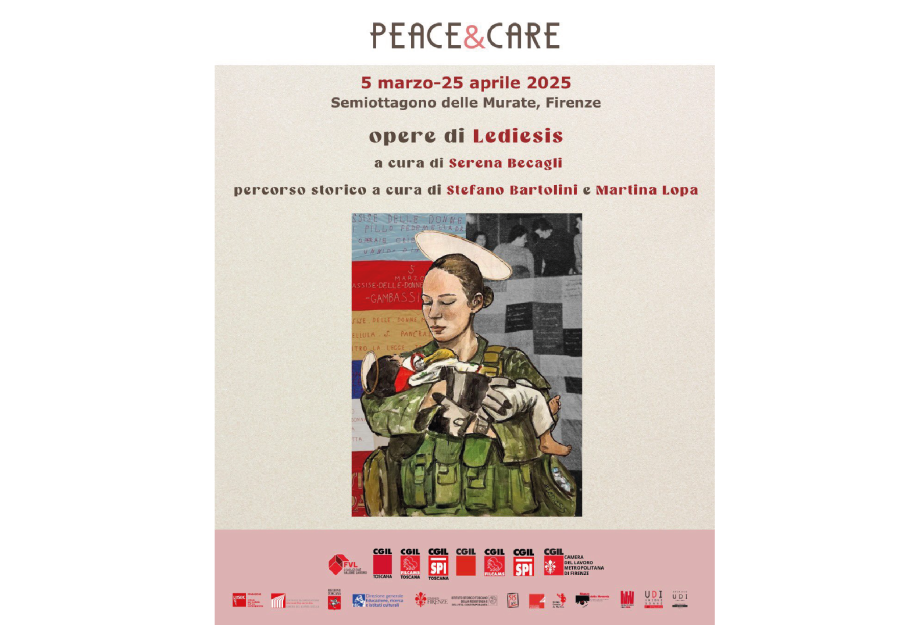 “Peace & Care” è la mostra promossa da Fondazione Valore Lavoro, CGIL Toscana, FILCAMS Cgil Toscana e SPI Cgil Toscana che sarà inaugurata mercoledì 5 marzo alle 18:00 (con musiche di Letizia Fuochi) e sarà visitabile fino al 25 aprile a Firenze presso il Semiottagono delle Murate in piazza Madonna della Neve (ingresso libero dal lunedì al venerdì ore 9-13 e 14-16, sito www.unalottasenzatempo.it, email politichedigenere@tosc.cgil.it).