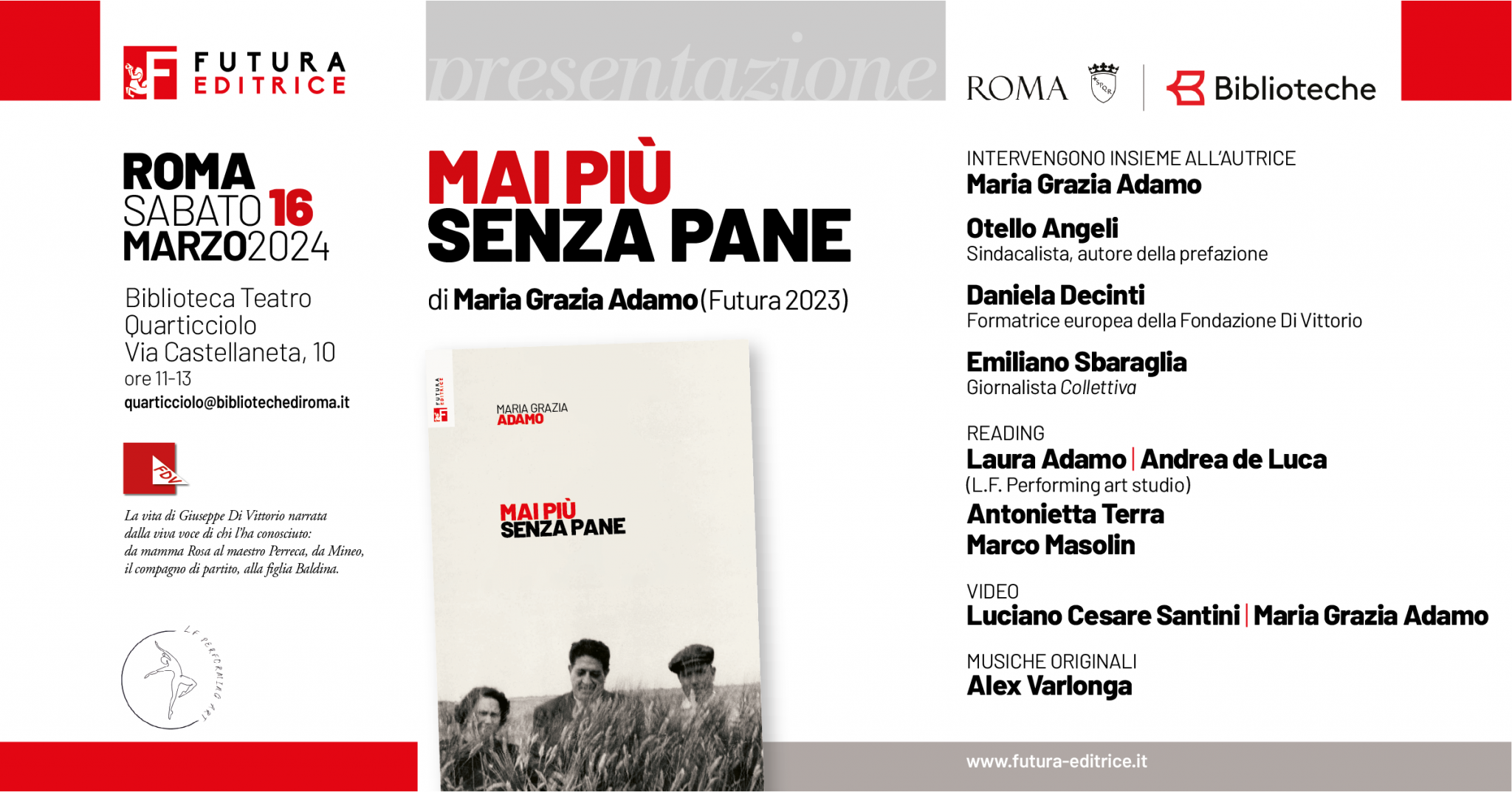 Verrà presentato sabato 16 marzo a Roma, presso la Biblioteca del Quarticciolo, il volume Mai più senza pane di Maria Grazia Adamo (Futura Edizioni 2023) che racconta la vita di Giuseppe Di Vittorio narrata dalla viva voce di chi l’ha conosciuto: da mamma Rosa al maestro Perreca, da Mineo, il compagno di partito, alla figlia Baldina.