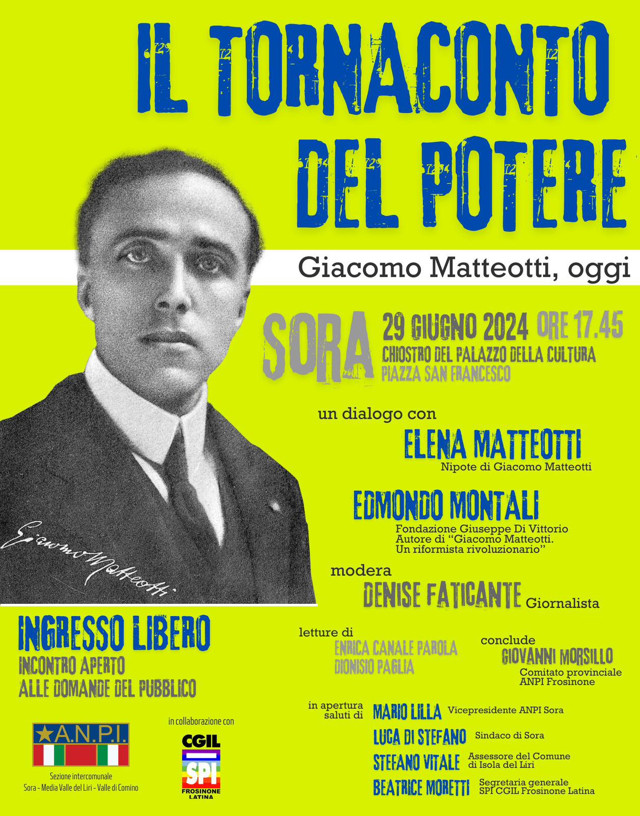 Nell’anno del centenario dell’assassinio di Giacomo Matteotti per mano di squadristi fascisti, l’Anpi e lo Spi Cgil di Frosinone Latina hanno organizzato una iniziativa ad ingresso libero dal titolo “Il tornaconto del potere. Giacomo Matteotti, oggi”. La giornalista Denise Faticante modererà un dialogo con Elena Matteotti (nipote di Giacomo) ed Edmondo Montali, responsabile dell’Area Storia FDV e autore di “Giacomo Matteotti. Un riformista rivoluzionario”. Il dialogo sarà aperto alle domande col pubblico. In apertura saluti di Mario Lilla (Vicepresidente ANPI Sora), Luca Di Stefano (Sindaco di Sora), Stefano Vitale (Assessore del Comune di Isola del Liri) e Beatrice Moretti (Segretaria Generale SPI CGIL Frosinone Latina), conclusioni di Giovanni Morsillo (Comitato provinciale ANPI Frosinone). Durante il dialogo ci saranno letture sul tema a cura di Enrica Canale Parola e Dioniso Paglia.